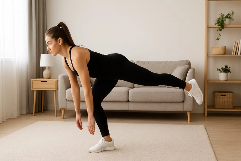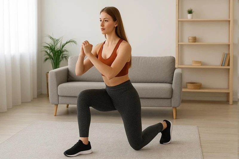 01. 一脚向前跨步,后脚脚跟抬起。02. 前脚膝盖弯曲90度,后脚膝盖接近地面。03. 推回站立,再换脚。组数:每腿10下× 3组。